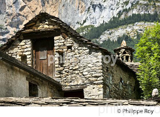 MAISON TRADITIONNELLE EN PIERRE ET TOIT DE LAUSE, VILLAGE ABANDONNE DE ESCUAIN, VALLE DE YAGA, GARGANTA DE ESCUAIN, PARQUE NACIONAL DE ORDESA Y MONTE PERDIDO, COMMUNE DE PUERTOLAS, PYRENEES ESPAGNOLES, COMARQUE DE SOBRARBE, PROVINCE DE HUESCA, COMMUNAUTE AUTONOME D' ARAGON, ESPAGNE, EUROPE.