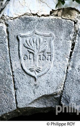 BLASON SUR LINTEAU DE PORTE D' UN ANCIEN HOTEL PARTICULIER , CALLE FATAS, VILLAGE PERCHE DE TORLA ORDESA , VALLE DE L' ARA, PARQUE NACIONAL DE ORDESA Y MONTE PERDIDO, PYRENEES ESPAGNOLES, COMARQUE DE SOBRARBE, PROVINCE DE HUESCA, COMMUNAUTE AUTONOME D' ARAGON, ESPAGNE, EUROPE.