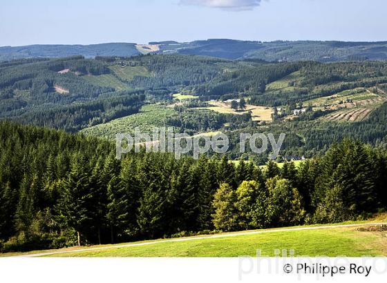 PANORAMA DEPUIS LE MONT BESSOU, 977 METRES, SUR LE PLATEAU DE MILLEVACHES , PARC NATUREL REGIONAL DE MILLEVACHES EN LIMOUSIN, OMMUNE DE MEYMAC, CORREZE, LIMOUSIN, NOUVELLE AQUITAINE, FRANCE.
