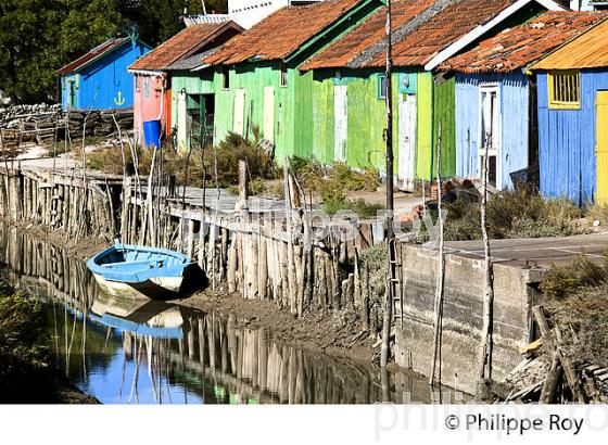 BARQUE ET CABANES OSTREICOLES AU BORD DU CHENAL DU PORT DE CHATEAU D' OLERON, HUITRES DE MARENNES OLERON, ILE D' OLERON , CHARENTE MARITIME , COTE ATLANTIQUE, POITOU CHARENTES, NOUVELLE AQUITAINE, FRANCE.