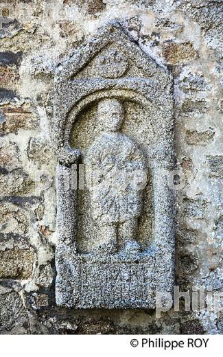 STELE FUNERAIRE GALLO-ROMAIN ENCHASSEE DANS LE MUR DE L' EGLISE ABBATIALE DE L' ANCIEN MONASTERE BENEDICTIN DU MOUTIER D' AHUN , 12 EME , 15 EME SIECLE, ANCIEN COMTE DE LA MARCHE, MASSIF CENTRAL, CREUSE, LIMOUSIN, NOUVELLE AQUITAINE, FRANCE.
