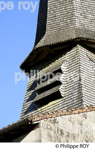 CLOCHER EN BARDEAUX DE CHATAIGNIER DE L' EGLISEDE L' ASSOMPTION DE LA TRES SAINTE VIERGE, VILLAGE DE SOUBREBOST, PAYS NATAL DE MARTIN DE MARTIN NADAUD, PARC NATUREL REGIONAL DE MILLE VACHES , ANCIEN COMTE DE LA MARCHE, MASSIF CENTRAL, CREUSE, LIMOUSIN, NOUVELLE AQUITAINE, FRANCE.
