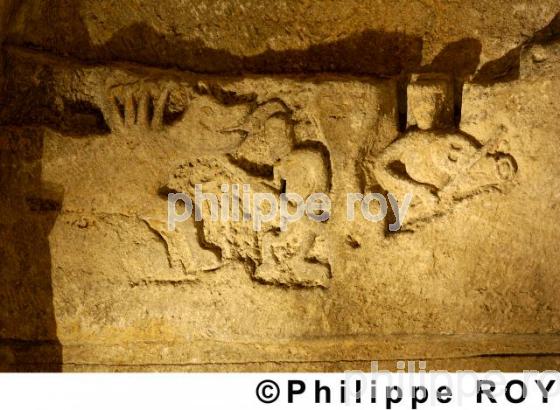 EGLISE MONOLITHE DE SAINT EMILION, GIRONDE, AQUITAINE, FRANCE - L'homme à la viole et le combat contre les forces du Mal (11è ou 12è siècles) - Bas relief sur le mur occidental de la Nef - Saint Emilion - 33 - Gironde - [Pas d'autorisation nécessaire]