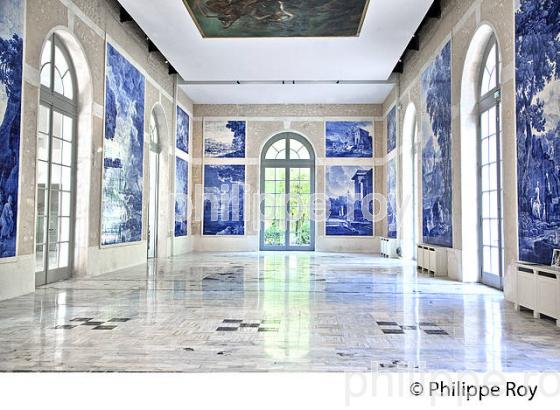 LA GRANDE GALERIE DES AZULEJOS, CHATEAU DE LA MERCERIE, DECOR ET EXTENSION REALISES PAR LES FRERES RAYMOND ET ALPHONSE RETHORE, 20 EME SIECLE, STYLE NEOCLASSIQUE, RENAISSANCE ITALIENNE, COMMUNE DE MAGNAC LAVALETTE VILLARS, ANGOUMOIS, CHARENTE, POITOU CHARENTES, NOUVELLE AQUITAINE, FRANCE.