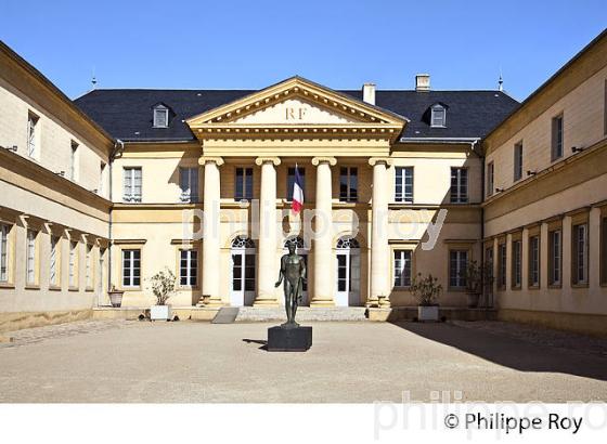 LA PREFECTURE, 19 EME SIECLE, STYLE NEOCLASSIQUE, ET SCULPTURE D' APOLLON, PAR LE SCUPTEUR CHARLES DESPIAU, RUE VICTOR HUGO, QUARTIER HISTORIQUE DE LA VILLE DE MONT DE MARSAN, LANDES, NOUVELLE AQUITAINE, FRANCE.