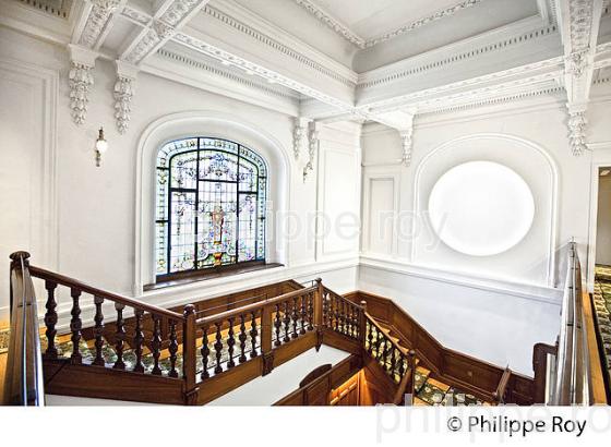 L' ESCALIER MONUMENTAL DE LA VILLA MIRASOL, 1912, STYLE BELLE EPOQUE, ARCHITECTE LEONCE LEGLISE, ANCIEN HOTEL PARTICULIER, ACTUEL HOTEL DE LUXE, 2, BOULEVARD FERDINAND CANDAU, QUARTIER HISTORIQUE DE LA VILLE DE MONT DE MARSAN, LANDES, NOUVELLE AQUITAINE, FRANCE.