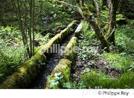 VESTIGES D' UNE CANALISATION EN PIERRE, POUR EMMENER L' EAU A UN MOULIN HYDROLIQUE, LIEU DIT DE NERGOUT, COMMUNE DE BEAUMONT DU LAC, LAC DE VASSIVIERE, PLATEAU DE MILLEVACHES, PARC NATUREL REGIONAL DE MILLEVACHES EN LIMOUSIN , HAUTE VIENNE, LIMOUSIN, NOUVELLE AQUITAINE, FRANCE.