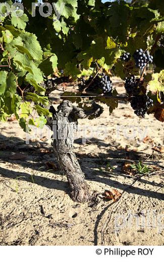 CEP DE VIGNE, POUSSANT DANS LE SABLE, RAISIN ROUGE, VIGNE DU DOMAINE DE LA POINTE, VIN DES SABLES ET DE L' OCEAN, VIGNOBLE HISTORIQUE DE CAPBRETON, COMMUNE DE CAPBRETON, COTE LANDAISE, LANDES, NOUVELLE AQUITAINE, FRANCE.