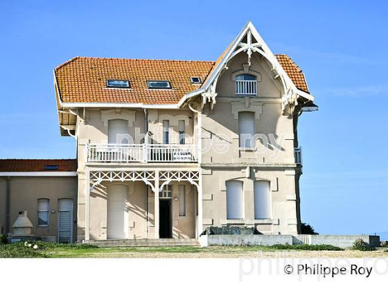 VILLA, STYLE BALNEAIRE 1900, SUR LA DUNE DE SABLE EN FRONT DE MER , PLAGE CENTRALE , STATION BALNEAIRE DE BISCARROSSE PLAGE , COTE LANDAISE, COTE D' ARGENT, LANDES, NOUVELLE AQUITAINE, FRANCE.