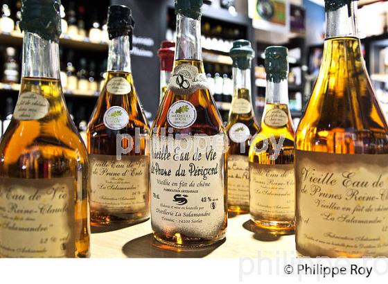 EAU DE VIE DE PRUNE DE LA DISTILLERIE LA SALAMANDRE , BOUTIQUE LE GOURMET PERIGOURDIN, CENTRE HISTORIQUE DE LA VILLE DE SARLAT LA CANEDA, PERIGORD NOIR, VALLEE DE LA DORDOGNE, DORDOGNE, NOUVELLE AQUITAINE, FRANCE.