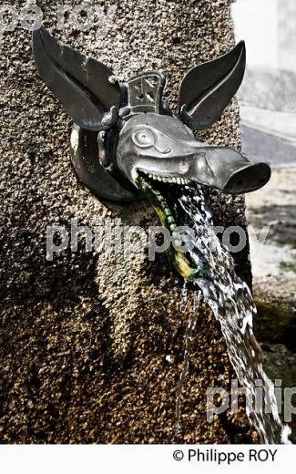 FONTAINE ET TETE DE CARNYX, TROMPETTE GAULOISE, VILLAGE DE NAVES, CORREZE, LIMOUSIN, NOUVELLE AQUITAINE, FRANCE.