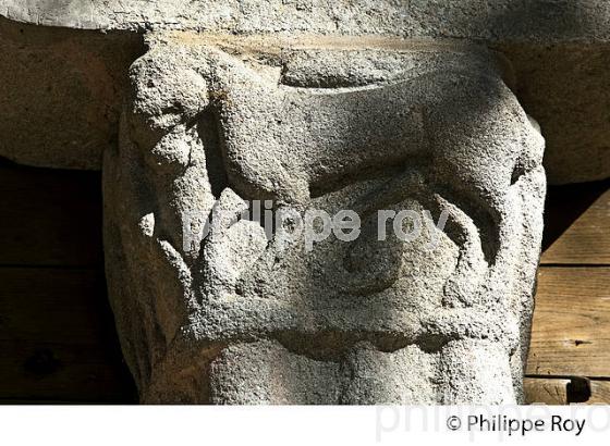 CHAPITEAU DU PORTAIL DE L' EGLISE FORTIFIEE DE SAINT AMANT, 12 EME, 13 EME SIECLE, STYLE ROMAN, VILLAGE DE SAINT CHAMAND, HAUTE VALLEE DE LA DORDOGNE, CORREZE, LIMOUSIN, NOUVELLE AQUITAINE, FRANCE.