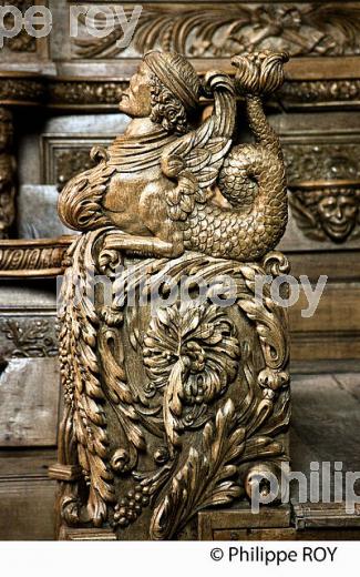 BOISERIES DES STALLES, SCULPTURE SUR BOIS DE SIMON BAUER, 17 EME SIECLE, STYLE BAROQUE, CHOEUR DE L' EGLISE DE L' ANCIEN MONASTERE BENEDICTIN DU VILLAGE DE MOUTIER D' AHUN, VALLEE DE LA CREUSE, PLATEAU DE MILLEVACHES , PARC NATUREL REGIONAL DE MILLEVACHES , CREUSE, LIMOUSIN, NOUVELLE AQUITAINE, FRANCE.
