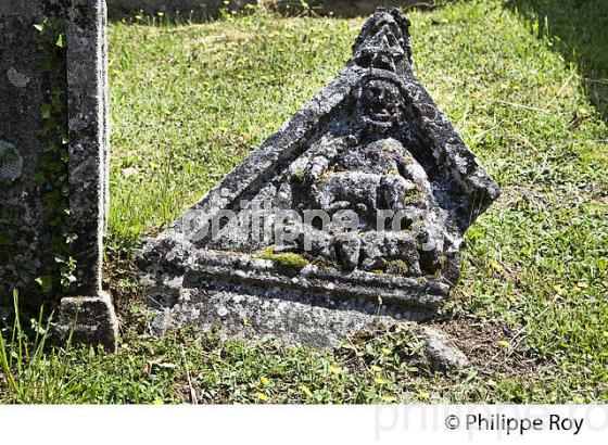 2022, FRONTON DE TOMBE EN GRANIT SCULPTEE PAR UN MACON CREUSOIS , DANS LE CIMETIERE DU VILLAGE DE GENTIOUX PIGEROLLES, ANCIEN COMTE DE LA MARCHE, PARC NATUREL REGIONAL DE MILLEVACHES EN LIMOUSIN, CREUSE, LIMOUSIN, NOUVELLE AQUITAINE, FRANCE.