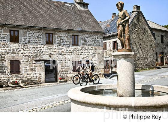 CYCLISTE EN VTT ELECTRIQUE DANS LE VILLAGE DE SAINT QUENTIN LA CHABANNE, PLATEAU DE MILLEVACHES , PARC NATUREL REGIONAL DE MILLEVACHES , CREUSE, LIMOUSIN, NOUVELLE AQUITAINE, FRANCE.