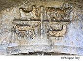 BLASON REPRESENTANT LES ANIMAUX DE LA FERME, VACHE, ANE, POULE, SUR LE FRONTON DU PORTAIL DE L' EGLISE ROMANE DU VILLAGE DE MONTAGNE DE BEON , VALLEE D' OSSAU, EN AUTOMNE , COMMUNE DE ASTE BEON, BEARN, PYRENEES ATLANTIQUES, AQUITAINE, NOUVELLE...