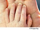 MAIN DE BEBE, UN MOIS, DANS LA MAIN DE SON PERE.