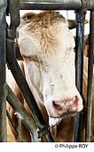 TETE DE VACHE DE RACE BLONDE D' AQUITAINE, DANS LE CORNADIS DE LA MANGEOIRE DE LA STABULATION LIBRE A L' ETABLE, IGP BOEUF DE CHALOSSE, LABEL ROUGE, COMMUNE DE HEUGAS, CHALOSSE, SUD ADOUR, LANDES, AQUITAINE, NOUVELLE AQUITAINE, FRANCE.