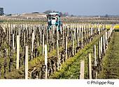 DECHAUSSAGE DE LA VIGNE, POMEROL, VIGNOBLE DU BORDELAIS, GIRONDE, FRANCE - Tracteur emjambeur pour déchausser la vigne au printemps (vigne chaussée à l'automne pour la protéger du froid) - Pomerol - 33 - Gironde - [pas d'autorisation nécessaire]