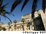SPLIT, LA COTE DALMATE, DALMATIE, CROATIE - La vieille ville de Split , centre historique - Palais de Dioclétien, ( 3°s.) , colonne et habitations dans la façade sud et palmier - Split - Dalmatie - HR - Croatie - Croatia - Hrvatska [Pas...