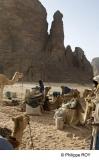 BIVOUAC, MEHAREE, DJEBEL, DESERT, SAHARA, PARC NATIONAL, TASSILI N' AJJER, DJANET, REGION ILLIZI, ALGERIE - Chameliers au bivouac préparant les dromadaires pour le départ de la méharée , entre Essendilène ( Frison-Roche) et Djanet, dans le...