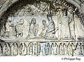 L' ADORATION DES ROIS MAGES ET L' EVEQUE SAINT BERTRAND, TYMPAN DU PORTAIL, 12 EME SIECLE, STYLE ROMAN DE LA CATHEDRALE SAINTE MARIE , VILLAGE PERCHE DE SAINT BERTRAND DE COMMINGES, CLUB ARBAS SALAT ANIMATION, VALLEE DE LUCHON, VIA GARONA,...