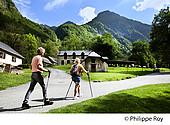 RANDONNEURS, MARCHE NORDIQUE, ET LES GRANGES D' ASTAU, MONTEE AU LAC D' OO, GR 10, NESTE D' OO, VAL D' ASTAU, LUCHONNAIS, COMMUNE D' OO , MIDI PYRENEES, OCCITANIE, FRANCE.
