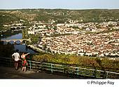 LE CINGLE DULOT , LA VILLE DE CAHORS, ET COUPLE DE TOURISTES AU PANORAMA DU MONT SAINT CYR , VALLEE DU LOT, QUERCY, LOT, MIDI PYRENEES, OCCITANIE, FRANCE.