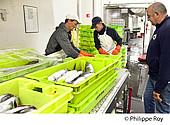 PREPARATION DES LOTS DE POISSON POUR LA VENTE DANS LA SALLE DE TRANSACTION DE LA CRIEE DU PORT DE PECHE D' ARCACHON, VILLE D' ARCACHON, BASSIN D' ARCACHON, GIRONDE, AQUITAINE, NOUVELLE AQUITAINE, FRANCE.