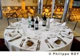 TABLE DRESSEE DANS LE CHAI DU CHATEAU DAUZAC, OENOTOURISME, MARGAUX, VINS DU MEDOC, GIRONDE, AQUITAINE, FRANCE. - Table dressée et chai à barriques du château Dauzac. AOC Margaux, cinquième cru classé. - Labarde - 33 - Gironde - [autorisation...