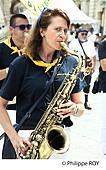 BANDA LOS DIVINOS DEVANT LA MAIRIE, POUR L' OUVERTURE DES FETES DE LA MADELEINE, FERIA, PLACE DU GENERAL LECLERC, QUARTIER HISTORIQUE DE LA VILLE DE MONT DE MARSAN, LANDES, NOUVELLE AQUITAINE, FRANCE.
