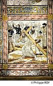 JESUS PORTANT SA CROIX, FRESQUE MURALE, 16 EME SIECLE DE LA VOUTE DE LA NEF DE L' EGLISE SAINT BARTHELEMY, 12 EME SIECLE, STYLE ROMAN, DU VILLAGE DE MONT, ROUTE DU COL DE PEYRESOURDE, VALLEE DU LOURON, HAUTES PYRENEES , MIDI PYRENEES,...