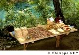 MONTAGNE DU MONTENEGRO - PARC DU DURMITOR - Gorges ( canyon) de la Tara à Durdevica Tara . - Parc national du Durmitor . - Table dressée de spécialités culinaires : charcuterie , pain de campagne et fromage , pour pique nique de touristes . -...