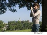 PHOTO, OENOTOURISME, VILLAGE, SAINT EMILION, AOC SAINT EMILION, VIGNOBLE DE BORDEAUX, GIRONDE, AQUITAINE, FRANCE - Jeune fille prenant une photo, paysage viticole et village de Saint Emilion . - Saint Emilion - 33 - Gironde - [ pas d'autorisation...