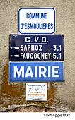 PLAQUE EMAILLEE D'INDICATION ROUTIERE SUR LA FACADE DE LA MAIRIE DU VILLAGE D'ESMOULIERES, PLATEAU DES MILLE ETANGS, PARC NATUREL REGIONAL DES BALLONS DES VOSGES, HAUTE-SAONE (70), FRANCHE-COMTE, FRANCE [pas d'autorisation nécessaire]