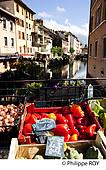 ETAL DE LEGUMES, MARCHE SUR LE PONT DE LA REPUBLIQUE QUI ENJAMBE LA RIVIERE LE THIOU, VIEIL ANNECY, HAUTE-SAVOIE (74), RHONE-ALPES, FRANCE [pas d'autorisation nécessaire]