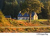 MAISON TRADITIONELLE CORREZIENNE ET FORET DE CONIFERES SUR LE PLATEAU DE MILLEVACHES PRES DU VILLAGE DE VIAM, VALLEE DE LA VEZERE, PARC NATUREL REGIONAL DE MILLEVACHES EN LIMOUSIN, CORREZE, LIMOUSIN, NOUVELLE AQUITAINE, FRANCE.