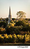 COULEURS D' AUTOMNE DANS LES VIGNES D ET LE CLOCHER DE L' EGLISE DU VILLAGE DE SAUTERNES , VINS AOC BARSAC SAUTERNES, ROUTE DES VINS DE GRAVES ET SAUTERNES, COMMUNE DE SAUTERNES, GIRONDE, AQUITAINE, NOUVELLE AQUITAINE, FRANCE.